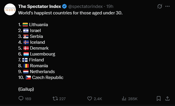 Naime, dva mesta ispred Srbije, nalaze se samo Litvanija, koja inače godinama prednjači po tzv. srećnom životu, a onda i Izrael, koji je u stopu prati, objavljeno je na nalogu Spectator Index na popularnoj društvenoj mreži.